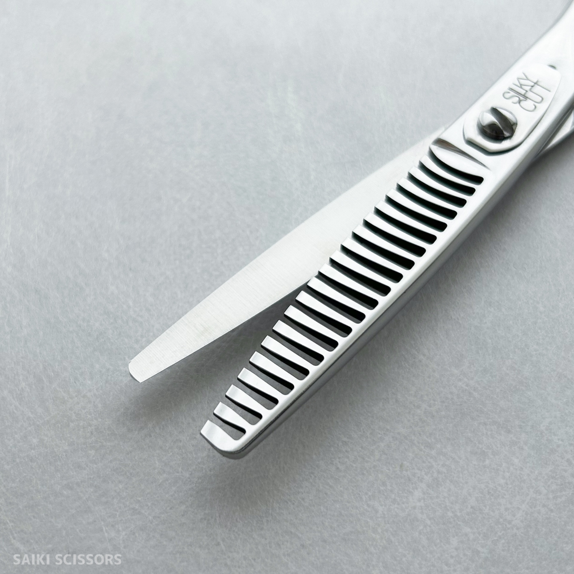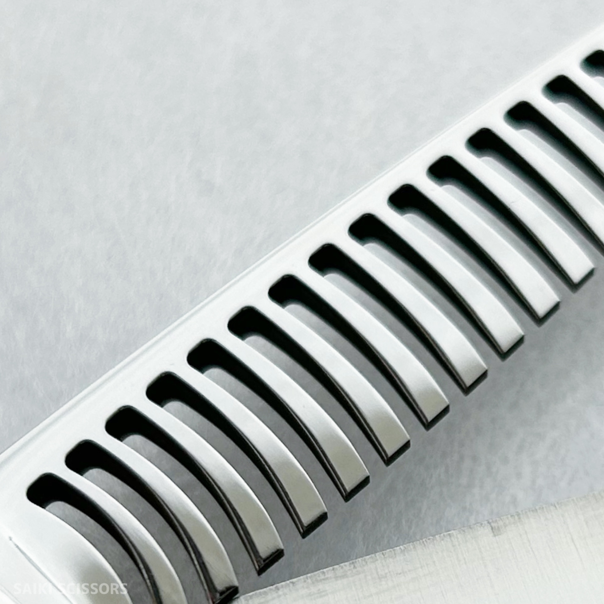 棒刃を特殊加工することで、刃を閉じたままどの角度から抜いても髪の毛を引っ掛けることなく抜け、さらに表面を傷つけず、イングラデーションセニングを実現したセニングシザーです。